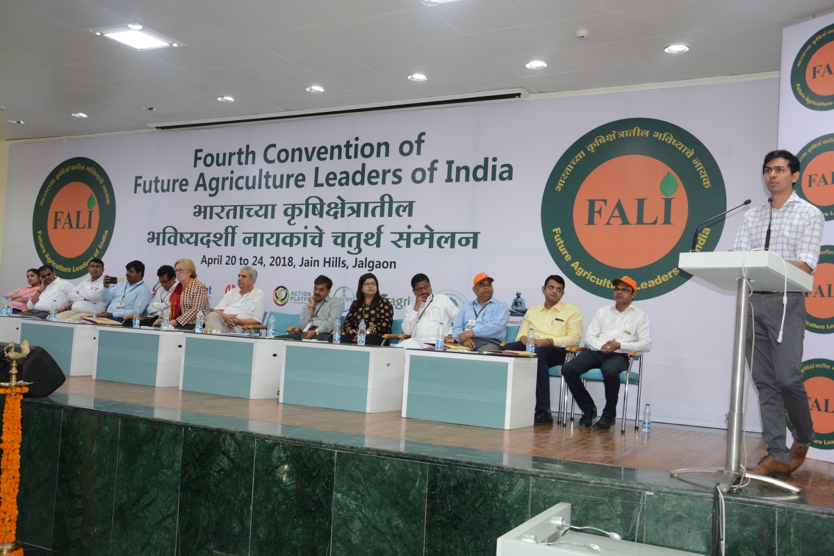 Jain Farm Fresh Foods Ltd addresses students in 'FALI-2018.' Dr. D N Kulkarni, Nancy Berry, Dr. Sanjay Toke, Natha Dodiya, Vishnu Gupta, Kamlakar Mahamuni, Vilas Mandlik, Divya Barmani, Balaji Hake, Alibiya Mujumdar and Viren Brahma are also seen.