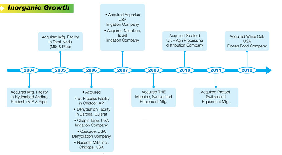आज विश्व भर में फैले हुए हमारे 10,000 से अधिक समर्पित सहयोगियों की सहायता से हमने अपने विस्तृत उत्पादन जैसे सुक्ष्म सिंचाई प्रणाली कृषि आदानो, कृषि प्रसंस्करित उत्पाद, प्लास्टिक पाईप्स और शीट्स आदि के व्यवसाय में अग्रणीयता स्थापित की है।