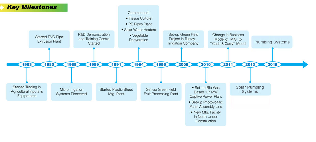 वर्ष 1989 में शुरूवात करके, जल प्रबन्धन के क्षेत्र में अग्रणीयता के लिये संघर्ष व मजबूत जीजिविशा से नई नई तकनीकों से भारतीय कृषि के अनुरूप सुक्ष्म सिंचाई प्रणालियों को प्रस्तुत किया। इस प्रकार से कृषि उद्योग विकास में एकात्मक पहुँच रखते हुये हमने एक लम्बा रास्ता तय किया है।