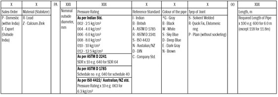 • सामान्यत: 6 मीटर लम्बाई में प्लेन एन्ड और सॉकेट एन्ड में (सॉल्वेन्ट सिमेन्ट वेल्डिंग) अन्य लम्बाई में पाईप मांग पर प्रदाय किये जाते है।